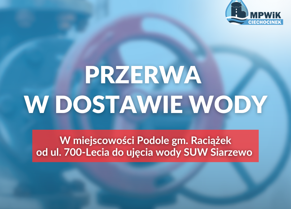 Z powodu inwestycji realizowanej przez Gminę Raciążek (niezależnej od MPWiK Sp. z o.o. w Ciechocinku), w miejscowości Podole gm. Raciążek od ul. 700-Lecia do ujęcia wody SUW Siarzewo, nastąpi przerwa w dostawie wody.